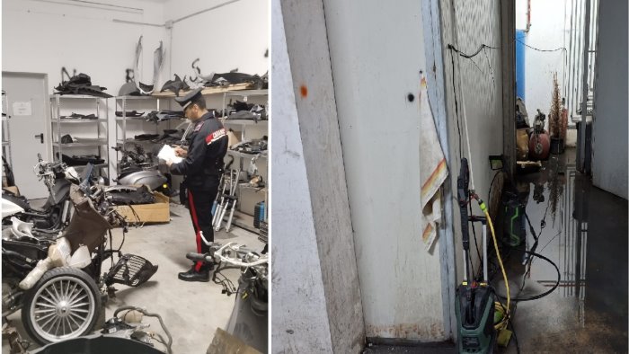L’officina, allestita in tutte le sue parti e prevalentemente adibita a carrozzeria e lavori di meccanica su ciclomotori e autoveicoli, è stata sottoposta a sequestro unitamente a 32 motoveicoli, un’autovettura Fiat Punto e tre telai.