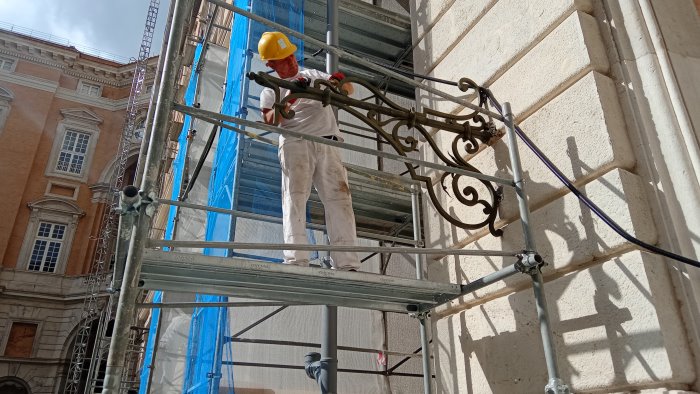 "L'attività ha previsto la rimozione delle vernici ossidate e compromesse, il consolidamento dei sostegni metallici delle lanterne, la sostituzione dei vetri con nuove lastre in supporto safety e il ripristino dei corpi illuminanti. Il lavoro si pone in continuazione con quello eseguito sugli altri otto lampioni in prossimità degli androni laterali all’ingresso principale della facciata della Reggia, nel 2022, e fa riferimento al medesimo progetto con apposito programma diagnostico preliminare - fanno sapere dall'ufficio stampa del monumento -. Seguiranno, in altri stralci di finanziamento, gli interventi sulle restanti lanterne in facciata, nei cortili e lungo la galleria porticata, il cosiddetto “cannocchiale”. I lavori rientrano tra le attività del Programma operativo complementare di azione e coesione 2014-2020 al Pon Cultura e Sviluppo 2014-2020 e sono eseguiti dalle ditte F.lli Navarra srl e I.CO.RES.