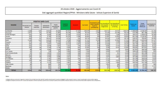 Il totale dei positivi attuali è pari a 142.739, dei quali 133.415 in isolamento domiciliare. I ricoverati in ospedale con sintomi sono 8.454, quasi 800 in più di ieri. Sono invece 870 i pazienti ricoverati in terapia intensiva, 73 in più di ieri. A livello regionale, resta quello lombardo il territorio più problematico con 2.023 nuovi casi, seguito da Piemonte con 1.396, dalla Campania con 1.312 e Lazio 1.224.