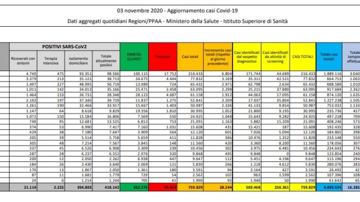 Sono 28.244 i nuovi casi di Coronavirus registrati nelle ultime 24 ore in Italia. Il totale dei positivi da inizio emergenza è di 759.829 persone. Lo riferisce il bollettino del Ministero della Salute. I decessi registrati nelle ultime 24 ore sono 353, per un totale di 39.412. I nuovi dimessi/guariti sono 6.258, per un totale di 302.275. Le persone attualmente positive sono 418.142, con un incremento nelle ultime 24 ore di 21.630 persone. I tamponi sono stati 182.287, in aumento rispetto ai 135.731 di ieri. (Italpress)