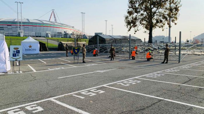 Iniziati nel parcheggio dell'Allianz Stadium, le operazioni di allestimento del "Drive Through Difesa" (Dtf), la struttura ad accesso in auto che ospitera' un hotspot per tamponi rapidi voluto dalla Regione Piemonte e realizzato in collaborazione con il Comune di Torino e la Juventus. (ITALPRESS).