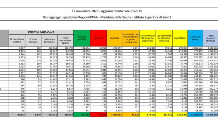 Tornano a salire i nuovi casi di coronavirus in Italia. Sono infatti 37.978 i nuovi contagiati contro i 32.961 di ieri. Aumentato anche il numero dei tamponi, 234.672 a fronte dei 225 mila di ieri. In aumento anche i decessi, 636 contro i 623 del giorno precedente. E' quanto risulta dal bollettino del Ministero della Salute. Le persone attualmente positive nel Paese sono 635.054 con un incremento di 21.694. I dimessi/guariti oggi sono 15.645. I ricoverati con sintomi sono 29.873 (circa 400 in più rispetto al giorno precedente) dei quali 3.170 (+189) nelle terapie intensive. In isolamento domiciliare si trovano in 602.011 (+21.478). La regione con il maggiore incremento di positivi anche oggi è la Lombardia (9.291), seguita da Piemonte (4.787) e Campania (4.065).
