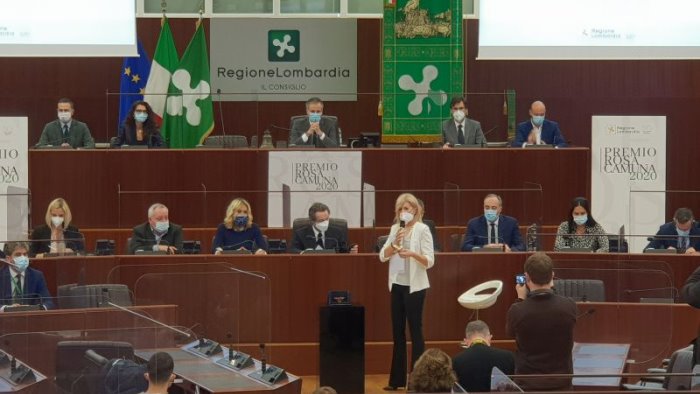 "Questa pandemia ha segnato una battuta d'arresto nella crescita che la nostra regione stava realizzando fino a febbraio, ma la Lombardia è la più grande regione d'Italia, è una delle prime regioni in Europa ed è l'unica regione italiana che si può confrontare con il mondo intero. Questa pandemia ha frenato questo suo modo di essere ma non l'ha bloccato". Lo afferma il presidente della Regione Lombardia, Attilio Fontana, nel suo intervento a Palazzo Pirelli alla premiazione dei vincitori 2020 della Rosa Camuna, il massimo riconoscimento assegnato ogni anno dalla Lombardia alle personalità e alla realtà che si sono distinte in campo economico, sociale, culturale e sportivo. (Italpress)