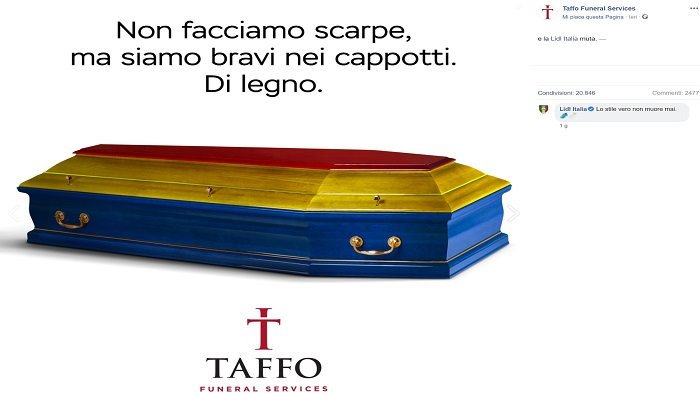 È guerra a colpi di marketing quella tra la Lidl, tornata alla ribalta in questi giorni per il “caso delle scarpe” e Taffo, agenzia funebre romana, famosa sui social network per i suoi post irriverenti e scherzosi sulla morte. Taffo ha scelto di intervenire con un post ad hoc su Instagram e Facebook, sfruttando l'ondata mediatica che ha avuto la catena di supermercati. Il post, accompagnato dall'immagine di una bara colorata di rosso, giallo e blu, cita: “Non facciamo scarpe, ma siamo bravi nei cappotti. Di legno” e nella didascalia, la postilla: “E la Lidl muta”.