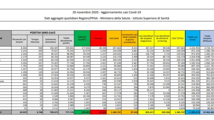 Boom di guariti, 21.035. Sul versante dei ricoveri, si registra un aumento di 347 portando il totale a 33.957; continuano a rallentare i nuovi ricoveri in terapia intensiva, +36, determinando il numero complessivo di 3.748. Coloro che sono in isolamento domiciliare sono invece 739.471. La regione con il maggiore numero di nuovi positivi è la Lombardia con 9.221, a seguire Campania (4.226) e Piemonte 3.861.
