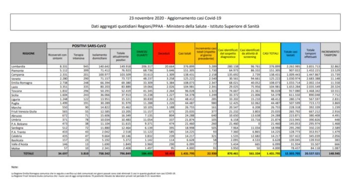 Attualmente i positivi in Italia sono 796.849, dei quali 758.342 in isolamento domiciliare. I ricoverati in ospedale con sintomi sono 34.697 (+418 rispetto a ieri), di questi 3.810 in terapia intensiva (+9). La regione con il maggior numero di nuovi casi è la Lombardia con 5.289, seguita da Veneto (2.540), Emilia-Romagna (2.347) e Lazio (2.341). Le Regioni con minore incremento di contagi sono Basilicata (58), Valle d'Aosta (77) e Molise (91).