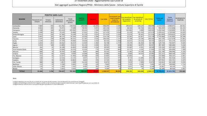 Le buone notizie si evidenziano anche sul fronte ospedaliero: calano i ricoverati che passano dai 34.038 di ieri ai 33.684 di oggi (-354). Idem per le terapie intensive, con una flessione di 64 pazienti portando il numero totale a 3.782 ricoverati. In isolamento domiciliare si trovano in 750.427. I tamponi processati sono stati 222.803. Per quanto riguarda il contagio nelle singole regioni, la Lombardia e' quella con il maggiore numero di contagi (5.389), seguita da Veneto (3.418) e Piemonte (3.149).
