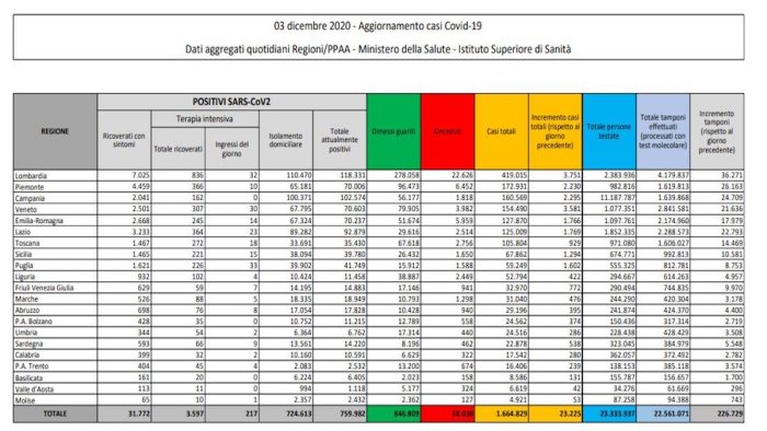 Continuano a crescere i casi di coronavirus in Italia. Sono infatti 23.225 i nuovi positivi, in aumento rispetto ai 20.709 registrati ieri. Ma il dato più grave riguarda il numero dei decessi che oggi tocca un nuovo record: 993 morti. Continua comunque a decrescere il numero degli attualmente positivi, con una flessione di 1.248 persone e che porta il numero totale a 759.982. Sono invece 23.474 i guariti. E' quanto si apprende dalla lettura del consueto bollettino del Ministero della Salute.