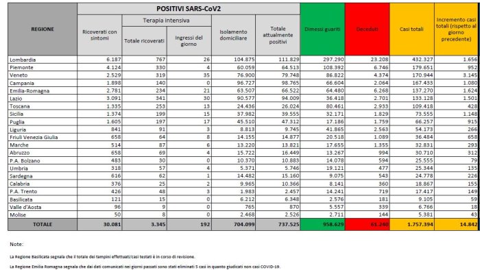 In Italia sono 14.842 i nuovi casi di covid, secondo il bollettino del Ministero della Salute. Ieri erano stati 13.720, a fronte però nelle ultime 24 ore di un aumento considerevole di tamponi: 149.232 (ieri ne erano stati processati 111.217). I decessi nelle ultime 24 ore sono stati 634. Boom di guariti, 25.497 mentre si registra un forte calo degli attualmente positivi, -11.294 e che porta il totale a 737.525. Il rapporto tra nuovi casi e numero di tamponi scende sotto il 10%. (ITALPRESS)