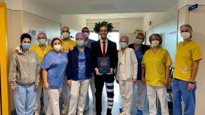 I tempi, proprio per il doppio intervento, si sono dilatati e così la discussione della laurea è avvenuta in ospedale.
