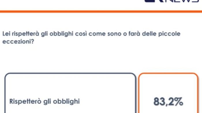 Nelle ultime ore, il Governo e le Regioni stanno discutendo sull'ipotesi di introduzione di nuove restrizioni per il periodo natalizio per evitare assembramenti e spostamenti come successo in questo ultimo fine settimana, con il rischio di una importante ripresa dei contagi. Al momento, le restrizioni maggiori e il divieto totale di spostamento riguardano esclusivamente i giorni di festa (25-26 e 31 dicembre - 1 gennaio). Sulla base di questo, oltre l'80% degli italiani mostra senso di responsabilità e dichiara che rispetterà gli obblighi previsti. Un rispetto che si estende in modo uniforme da Nord a Sud del Paese. É quanto risulta da un sondaggio di Euromedia Research.