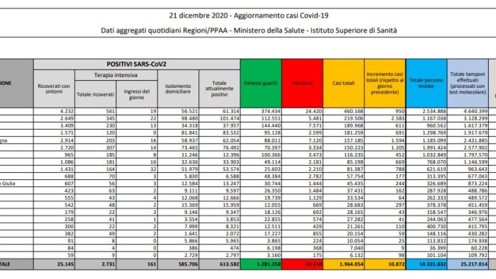 Sono 10.872 i nuovi casi di Coronavirus in Italia, 4.232 in meno di ieri, quando furono 15.104. Un massiccio miglioramento che però dal minore numero di tamponi processati nelle ultime 24 ore: 87.889 (49.531 in meno rispetto a domenica). Ancora molto alto, invece, il numero delle vittime, ben 415 in più di ieri, con il totale dei decessi da inizio pandemia che arriva a 69.214. E' quanto emerge dal quotidiano bollettino sull'emergenza Coronavirus diffuso dal Ministero della Salute e dall'Istituto Superiore della Sanità. Gli attualmente positivi sono 613.582 (9.178 in meno rispetto a 24 ore fa, quando erano 622.760), dei quali 585.706 in isolamento domiciliare.