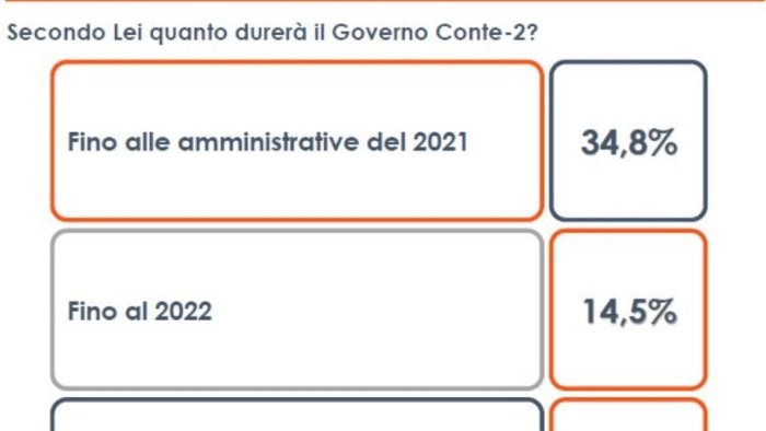 A causa di queste tensioni, l'elettorato si divide sull'ipotetica durata del Governo. Se da un lato, un terzo (il 34,8% degli intervistati crede che questo Governo durerà solo pochi mesi ancora, fino alle amministrative del 2021), un altro terzo è convinto che arriverà tranquillamente a fine legislatura.