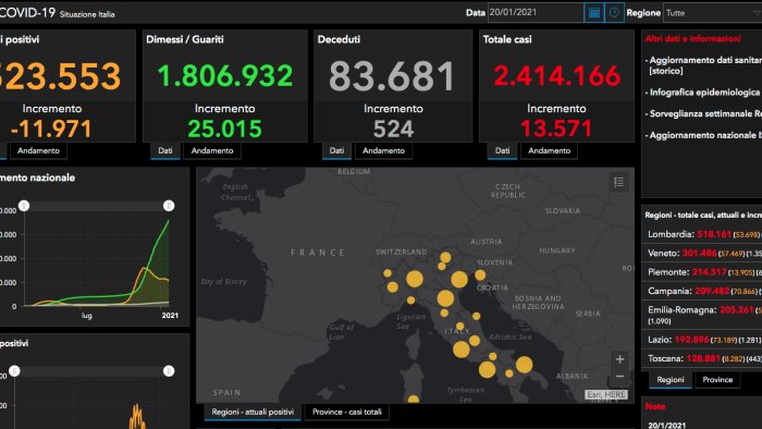 Nelle ultime 24 ore in Italia sono stati registrati 13.571 nuovi casi di coronavirus contro i 10.497 di ieri. I tamponi effettuati sono 279.762, in aumento rispetto a ieri quando erano 254.070. Il rapporto tamponi/positivi si attesta al 4,85%. E' quanto riporta il bollettino del Ministero della Salute. Secondo il bollettino, i morti oggi sono 524 (ieri erano 603) mentre i guariti sono 25.015 e gli attuali positivi sono 523.553, con una riduzione di 11.971 unita'. (Italpress)
