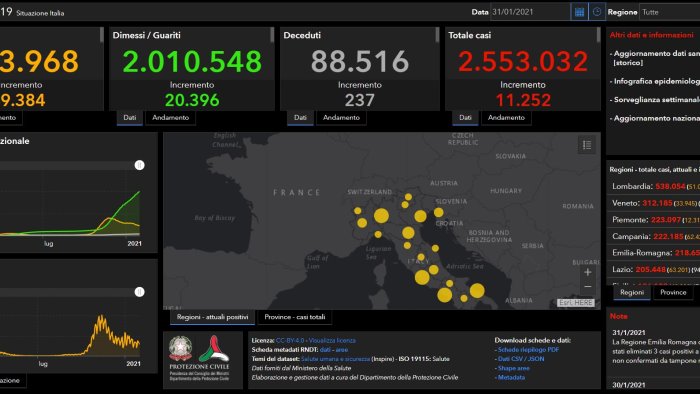 Sono 11.252 i nuovi casi di Coronavirus in Italia (ieri 12.715) a fronte di 213.364 tamponi effettuati su un totale di 32.666.726 da inizio emergenza. E' quanto si legge nel bollettino del Ministero della Salute - Istituto Superiore di Sanità di oggi. Nelle ultime 24 ore sono stati 237 i decessi per un totale di 88.516 vittime da inizio pandemia. Con quelli di oggi diventano 2.553.032 i casi totali di Covid in Italia. Attualmente i positivi sono 453.968 (-9.384 rispetto a ieri), 431.657 le persone in isolamento domiciliare. I ricoverati in ospedale con sintomi sono 20.096 di cui 2.215 in terapia intensiva (97 in più rispetto a ieri). I dimessi/guariti sono 2.010.548 con un incremento di 20.396 unità nelle ultime 24 ore. La regione con il maggior numero di nuovi casi nelle ultime 24 ore è la Lombardia (1.438), seguita da Campania (1.401), Emilia-Romagna (1.277), Puglia (1.069) e Lazio (943).