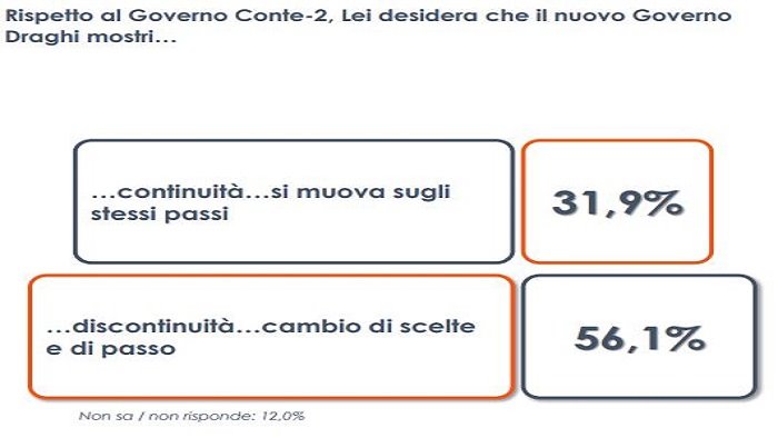 Considerando il peso dei singoli Ministri e l'importanza dei ruoli e delle tematiche da affrontare, si ritiene che la componente tecnica dell'esecutivo debba prevalere su quella politica. Da un punto di vista operativo e delle azioni da intraprendere, oltre la metà del campione chiede un cambio di passo e una discontinuità rispetto al Governo Conte 2. Si richiedono nuove scelte, dunque, ed un nuovo modo di operare per affrontare in primo luogo l'emergenza sanitaria e mettere in atto una strategia valida per il raggiungimento dell'immunità da Covid19 e, in secondo luogo, la riduzione del carico fiscale.
