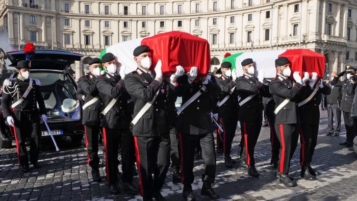 Ultimo saluto con i funerali di Stato all'ambasciatore Luca Attanasio e al carabiniere Vittorio Iacovacci a Roma uccisi in un agguato in Congo. "Luca, Vittorio e Mustafà sono stati strappati da questo mondo dagli artigli di una violenza stupida e feroce, che non porterà nessun giovamento ma solo altro dolore, dal male viene solo altro male", ha detto il Cardinale Angelo De Donatis, Vicario del Papa per la diocesi di Roma, nell'omelia nella Basilica di Santa Maria degli Angeli e dei Martiri a Roma.