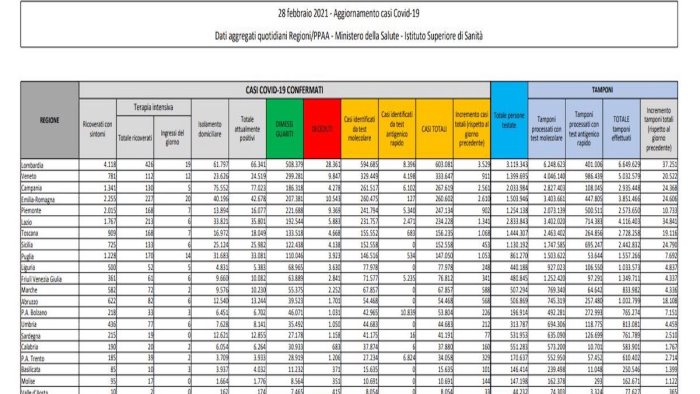 Sono 17.455 i nuovi casi di Coronavirus in Italia (ieri 18.916) a fronte di 257.024 tamponi effettuati su un totale di 40.132.887 da inizio emergenza. E' quanto si legge nel bollettino del Ministero della Salute - Istituto Superiore di Sanita' di oggi. Nelle ultime 24 ore sono stati 192 i decessi (ieri 280) per un totale di 97.699 vittime da inizio pandemia. Con quelli di oggi diventano 2.925.265 i casi totali di Covid in Italia. Attualmente i positivi sono 422.367 (+10.401), 401.498 le persone in isolamento domiciliare. I ricoverati in ospedale con sintomi sono 18.638 di cui 2.231 in terapia intensiva.