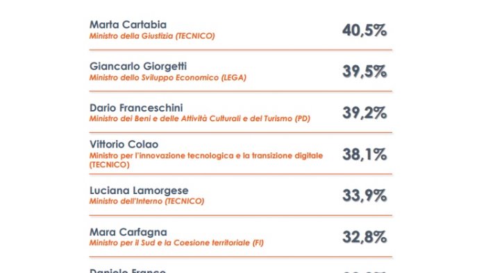 Seguono a ruota Giancarlo Giorgetti (Sviluppo economico - Lega) e Dario Franceschini (Beni e attività culturali e turismo - PD). Nel complesso è corretto sottolineare che nella lettura di questi dati è importante il dato della notorietà che incide - ovviamente - sul poter esprimere un giudizio di merito nell'indice di fiducia.