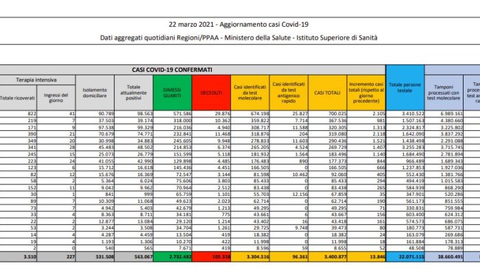 I guariti sono 32.720 e gli attuali positivi scendono a 563.067 (8.605 in meno rispetto a ieri). I ricoverati nei reparti ordinari sono 28.049, 565 in più rispetto a ieri. Nelle terapie intensive 3.510 ricoverati (+62 unità) con 227 nuovi ingressi. In isolamento domiciliare sono 531.508 persone. La regione con il maggior numero di casi è l'Emilia Romagna (2.118), seguita da Lombardia (2.105) e Piemonte (1.521).