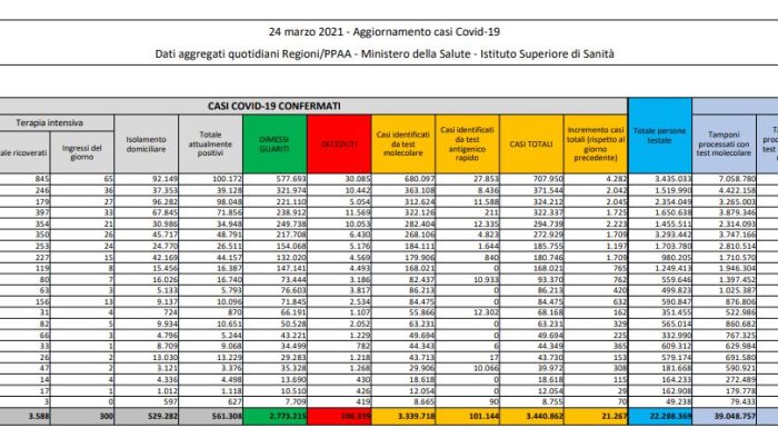 Lievissima crescita dei ricoveri nei reparti ordinari: 10 in più rispetto alle 24 ore precedenti, con un numero totale di degenti pari a 28.438. Molto più significativa la crescita delle terapie intensive, dove con 3.588 ricoverati si registra un saldo complessivo in crescita di 42 degenti con un numero di nuovi ingressi leggermente inferiore a ieri: 300. In isolamento domiciliare vi sono 529.282 persone. La regione con il maggior numero di casi è la Lombardia (4.282), seguita da Piemonte (2.223) e Campania (2.045). Superano i 1000 casi anche Veneto, Emilia-Romagna, Lazio, Toscana, Puglia.