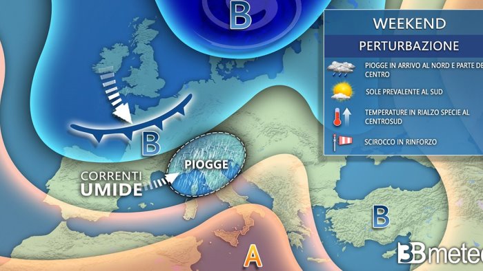 “Nel weekend tuttavia si cambierà registro, con una perturbazione atlantica che riporterà piogge e rovesci al Nord e in parte anche al Centro” - avverte Ferrara di 3bmeteo.com - “le precipitazioni saranno più incisive e abbondanti soprattutto da sabato sera e su Liguria, alta Toscana, Prealpi, alte pianure del Nord, mentre sulle Alpi torneranno nevicate diffuse ma in genere dalle quote medie. Qualche pioggia o rovescio interesserà pure il Centro, sebbene in modo più intermittente e con anche qualche apertura, più ampia e frequente su Abruzzo, basso Lazio e Sardegna. Il Sud invece godrà di tempo più asciutto e a tratti anche soleggiato, tra banchi nuvolosi sparsi di passaggio.”