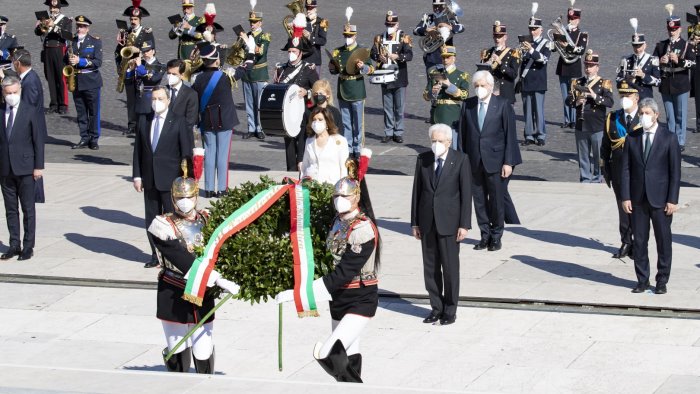 Mattarella, che in mattinata aveva deposto la corona all'Altare della Patria, ha poi proseguito: "Quando, dopo l'8 settembre, le truppe di Hitler invasero l'Italia, mutilandone l'integrita' territoriale, imponendo un giogo di brutalita', stermini, eccidi, deportazioni, con la collaborazione complice dei fascisti, migliaia e migliaia di italiani, militari e civili, compresero che la Patria in cui voler vivere e per cui si poteva anche morire, non poteva che essere libera, democratica, fondata sul diritto, sulla pace, sulla convivenza - afferma -. Furono i valori di pieta' e di civilta' della nostra gente, la ribellione contro la prepotenza e la furia cieca e devastatrice, a provocare le tante rivolte in molti paesi e citta' dell'intero territorio nazionale".