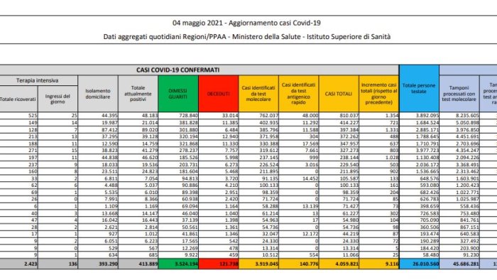 Prosegue il costante calo dei ricoveri nei reparti ordinari, oggi sono 18.176 (-219), mentre nelle terapie intensive vi sono ricoverati 2.423 con un saldo in negativo di 67 pazienti ma con 136 nuovi ingressi (ieri erano 121). In isolamento domiciliare vi sono 393.290 persone. La regione con il maggior numero di casi è la Lombardia (1.354), seguita da Campania (1.331), e Puglia (1.028).