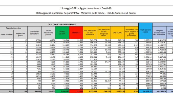 I guariti nelle ultime 24 ore sono 16.503 mentre gli attuali positivi scendono a 363.859 con un calo complessivo di 9.811. I ricoverati nei reparti ordinari sono 14.937 (-490), le terapie intensive sono a 2.056 (-102), ma con 100 nuovi ingressi. In isolamento domiciliare vi sono 346.886 persone. La regione con il maggior numero di casi è la Campania (1.109), seguita da Sicilia (894) e Lombardia (788).