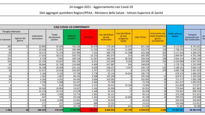 Sono 2.490 i nuovi casi di coronavirus in Italia (il 23 maggio erano 3.995) a fronte di 107.481 tamponi effettuati, determinando un tasso di positività del 2,32%. E' quanto riporta il bollettino del ministero della Salute. I decessi sono stati 110 nelle ultime 24 ore, in aumento rispetto ai 72 registrati ieri.