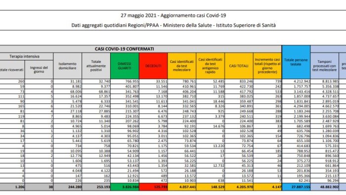 In crescita i casi di coronavirus in Italia nelle ultime 24 ore. Secondo i dati del Ministero della Salute, i nuovi positivi sono 4.147, in aumento rispetto ai 3.937 dell'ultima rilevazione nonostante una riduzione dei tamponi processati, 243.967, dato che fa alzare lievemente l'indice di positività all'1,69%. Tornano a crescere i decessi, 171 (+50). I guariti sono 10.808 e gli attuali positivi scendono a 253.193 (6.836 in meno alle 24 ore precedenti).