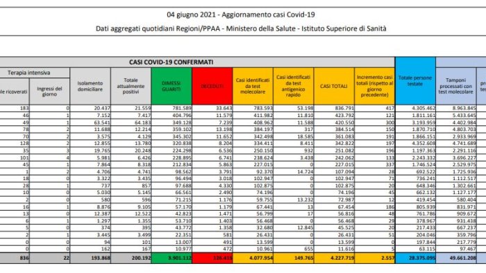 Sul fronte dei ricoveri si registra anche oggi un calo. Nei reparti ordinari le persone ricoverate sono 5.488 (-229), nelle terapie intensive vi sono invece 835 degenti, con un calo totale di 56 pazienti e 22 nuovi ingressi. Il calo riguarda anche le persone in isolamento domiciliare, ad oggi 193.868. Per quanto riguarda il contagio nelle singole regioni, quella che registra il maggior numero di nuovi casi è la Lombardia (417), seguita da Sicilia (337) e Campania (300). Al contrario in Molise non si registrano nuovi positivi.