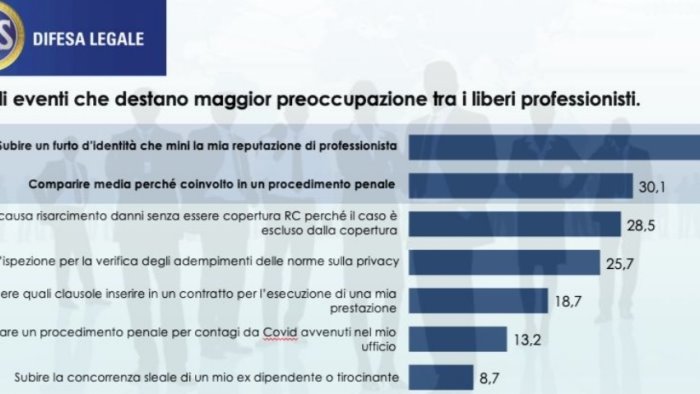 A causa della pandemia da Covid 19, cresce il timore dei liberi professionisti per il mancato pagamento delle fatture (64%), ma a preoccuparli sono anche i furti di identità informatica (41%) e l'eventuale esposizione mediatica a seguito di inchieste penali in cui potrebbero essere coinvolti (30%). E' quanto emerge da uno studio commissionato da DAS, compagnia di Generali Italia specializzata nella tutela legale, per ascoltare le esigenze dei liberi professionisti e affiancarli nel nuovo scenario pandemico. Più contenuti i timori per l'aumento delle contestazioni fiscali-amministrative (14%), i possibili procedimenti penali per contagi da Covid (13,2%), la concorrenza sleale di un ex collaboratore (8,7%), o una vertenza di lavoro di un dipendente (6,9%).