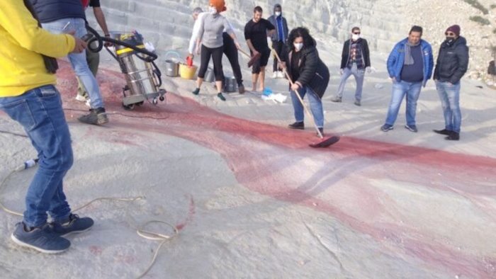 “La Regione Siciliana si è subito attivata, assieme al Comune, con le sue strutture sul territorio, per mettere in sicurezza la Scala dei Turchi, sulla costa siciliana di Realmonte (Agrigento), e ripulire l’area danneggiata in un luogo di rara bellezza, dopo il vile atto di vandalismo di ieri”. Lo dice il presidente della Regione Siciliana, Nello Musumeci. “Dalla Soprintendenza e dalla Protezione civile di Agrigento – ha aggiunto – ricevo messaggi rassicuranti circa il ripristino della scogliera. Il materiale rosso sversato è riconducibile a ossido di ferro in polvere e questo non ha costituito per fortuna un grosso rischio. Sul posto si sono recati di buon mattino i tecnici del Comune di Realmonte, due funzionari della nostra Soprintendenza e numerosi volontari, che stanno aspirando la polvere, per poi ripulire l’area con l’aiuto di una idropulitrice. Li ringrazio tutti per il generoso atto di civismo e di scrupolosa responsabilità dimostrati”. Ieri, vandali sono entrati in azione e hanno imbrattato la marna bianca con dell’intonaco di colore rosso. La Procura di Agrigento ha aperto un’inchiesta per danneggiamento di beni avente valore paesaggistico. I carabinieri, a cui il procuratore Luigi Patronaggio ha delegato le indagini, hanno acquisito le immagini del sistema di videosorveglianza.
