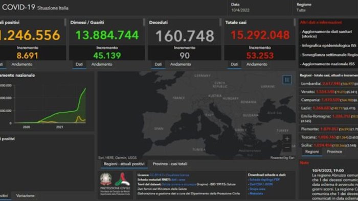 Nelle ultime 24 ore sono stati 90 i decessi (ieri 112), che portano il totale di vittime da inizio pandemia a 160.748. Con quelli di oggi diventano 15.292.048 i casi totali di Covid in Italia. Attualmente i positivi sono 1.246.556 (+8691), 1.236.053 le persone in isolamento domiciliare. I ricoverati in ospedale con sintomi sono 10.038 di cui 465 in Terapia intensiva. I dimessi/guariti sono 13.884.744 con un incremento di 45.139 unità nelle ultime 24 ore.