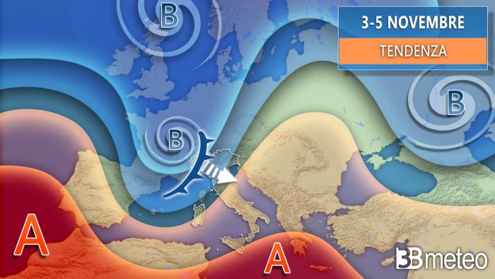 “La vera svolta tuttavia dovrebbe concretizzarsi tra la sera del 3 e venerdì 4 novembre, quando sembra arrivare di gran carriera una perturbazione più incisiva dal Nord Atlantico che attraverserà l’Italia da Nord a Sud, portando rovesci e temporali anche di forte intensità. Non si escludono locali nubifragi o comunque piogge di forte intensità in particolare su Lombardia, Liguria di Levante, Nordest in generale, successivamente tutto il versante tirrenico dalla Toscana fino anche alla Sicilia. Qualche rovescio o temporale localmente potrà interessare pure versante adriatico e Sardegna, ma in questo caso si tratterà di fenomeni in genere più rapidi e localizzati. Nel weekend residua instabilità al Sud e sul medio versante Adriatico, mentre sul resto d’Italia il tempo tenderà a migliorare.”
