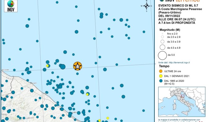 Intanto Non si ferma lo sciame sismico con epicentro nella zona dell'adriatico davanti a Pesaro e Fano. Secondo il sito dell'Ingv, ci sono state altre cinque scosse superiori a magnitudo 2 in una ventina di minuti, dopo quella di 3.1 delle 8.15. E il capo della Protezione Civile Fabrizio Curcio ha chiarito: "è stato "un evento importante" ma "non si registrano crolli". "non si attende un evento tsunami" perché con "il valore dell'evento a mare" del livello di quello che si è verificato poco dopo le 7 di oggi "in genere non produrre onde tsunami" ma comunque "è partito il sistema allertamento internazionale" con i paesi limitrofi.
