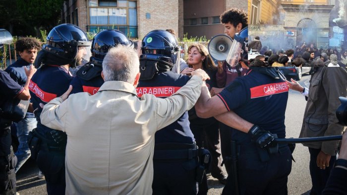La campanella suona, ma nessuno entra. Davanti all’Istituto Einaudi Chiodo la tensione è altissima fin dalle prime ore del mattino. È il primo giorno di lezioni dopo la tragedia di venerdì scorso, quando uno studente, Abanoub Youssef, 18 anni, è stato ucciso a coltellate all’interno della scuola. Per l’omicidio è accusato un altro allievo dell’istituto, Zouhair Atif. La ferita è ancora aperta e il ritorno in aula appare, per molti ragazzi, semplicemente impossibile. Centinaia di studenti restano compatti davanti al portone, rifiutandosi di varcare la soglia. Le voci si accavallano, la rabbia esplode. «Dovete chiuderla questa porta, quelli là dentro sono complici», urla una ragazza verso l’ingresso. Qualcuno replica che la scuola è un luogo pubblico, ma la risposta è immediata e carica di dolore: «Non lo è più, hanno ucciso un ragazzo e voi siete complici». Gli applausi scandiscono le accuse rivolte al personale scolastico rimasto all’interno dell’edificio. La situazione diventa delicatissima. I carabinieri e le altre forze dell’ordine cercano di contenere la pressione dei ragazzi assiepati davanti all’ingresso. Volano slogan, vengono accesi fumogeni, mentre il coro «Aba vive» rimbalza contro le mura della scuola. Tra i cartelli spicca una scritta che sintetizza la protesta: «I prof sono complici». È un momento di forte emotività, in cui rabbia e commozione si intrecciano senza filtri.