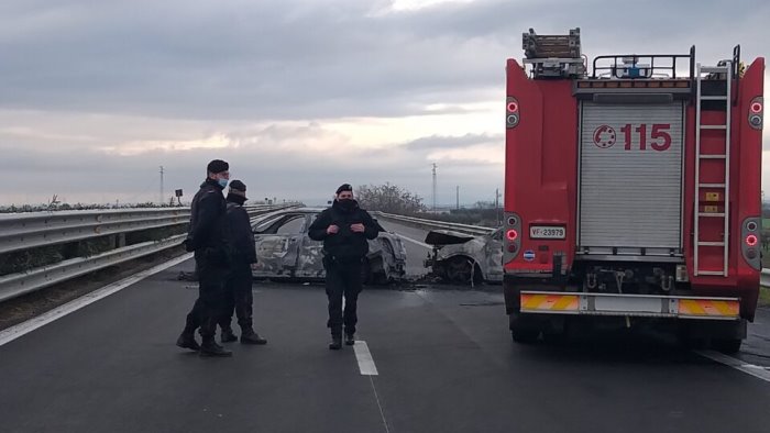 Le vetture date alle fiamme erano state poste di traverso per bloccare la corsa dei due mezzi blindati. Rinvenuti sulla carreggiata grossi chiodi. Sul posto carabinieri, vigili del fuoco e Anas.