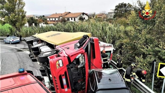 Un'ambulanza della croce rossa italiana è stata letteralmente schiacciata dal rimorchio di un tir. A bordo del mezzo di soccorso, l'autista un 28enne e un 81enne originario San Pietro Vernotico, in provincia di Brindisi. Quest'ultimo era stato appena dimesso dall'ospedale e stava facendo rientro a casa. Per entrambi non c'è stato purtroppo nulla da fare. Una terza persona, un operatore sanitario di 59 anni è stato trasportato all'ospedale regionale di Torrette in codice rosso. Le sue condizioni sono gravissime. Coinvolta nello schianto anche una terza vettura senza gravi conseguenze.