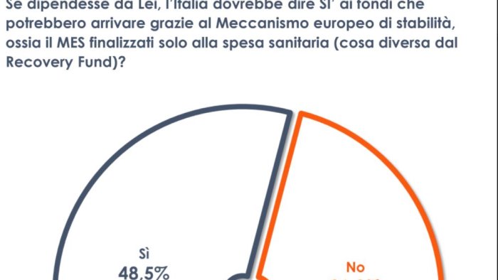 La pandemia che ha colpito il nostro Paese – e il Mondo intero – ha creato non pochi problemi anche da un punto di vista economico. Difficoltà che rischiano di diventare ancora più gravi con la seconda ondata di contagi. Si discute, quindi, da tempo, delle misure da attuare per affrontare la crisi e delle valutazioni su MES e Recovery Fund. In questo contesto, dunque, quasi la metà degli italiani si dichiara favorevole all’accettazione del MES (48,5%), in modo particolare se finalizzato alla sola spesa sanitaria, mentre il Recovery Fund potrebbe rappresentare per il 40,2% un primo passo per un vera ripresa economica del Paese. E’ quanto risulta da un sondaggio di Euromedia Research.