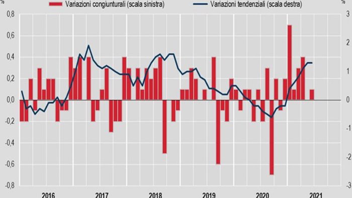 L'inflazione acquisita per il 2021 è pari a +1,3% per l'indice generale e a +0,6% per la componente di fondo.