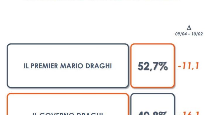 La fiducia nel presidente del Consiglio Mario Draghi in due mesi è passata dal 63.8% al 52.7% perdendo l'11.1% dei consensi. E' quanto risulta da un sondaggio di Euromedia Research.