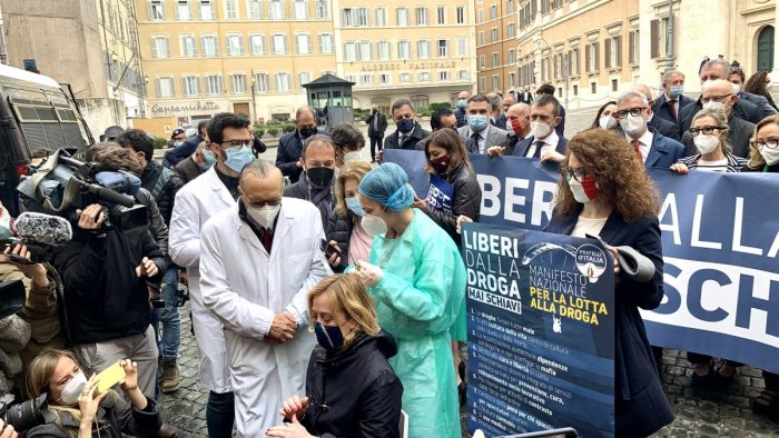 Infine promozione di campagne di prevenzione nazionale contro la droga e promozione di stili di vita sani. "Effettuare oggi il test antidroga è un modo per accendere i riflettori sulla devastazione del problema delle dipendenze in Italia, un problema abbandonato e dimenticato dalle istituzioni. C'è un morto di overdose al giorno, l'Italia è la prima nazione in Ue per diffusione di cannabis tra gli studenti, la terza per uso di cocaina. E' una situazione totalmente fuori controllo", ha detto il presidente di Fratelli d'Italia, Giorgia Meloni, in piazza Montecitorio. (Italpress)
