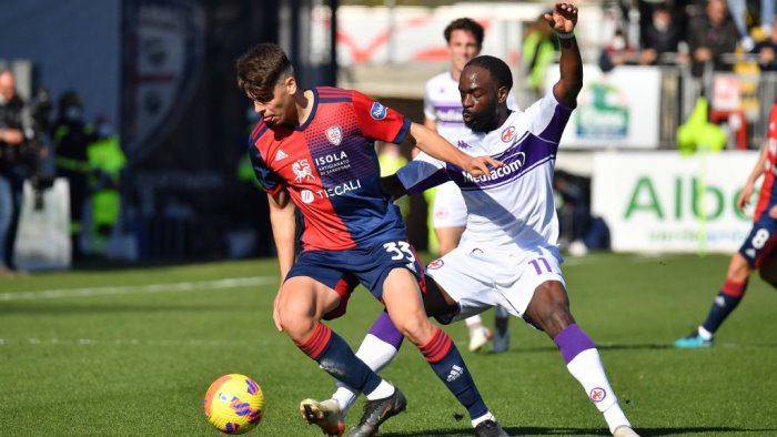 Tante assenze, un rigore sbagliato a testa e un'espulsione. Senza Vlahovic, la Fiorentina in dieci uomini riesce a pareggiare 1-1 sul campo del Cagliari. Tra squalifiche (Pavoletti e Carboni), covid (tre positivi) e infortuni (Nandez indisponibile dell'ultim'ora), anche Mazzarri è costretto a schierare una formazione d'emergenza. Nel 3-5-2 Pereiro è il partner di Joao Pedro, Obert il terzo in difesa con Dalbert tra gli interni di centrocampo. La squadra di Italiano ha mancato l'appuntamento con la rete in quattro delle ultime sette trasferte in Serie A, mentre il Cagliari prende gol da dodici partite interne consecutive. E l'avvio di gara offre subito la chance dell'1-0 ai viola: Bellanova non legge il taglio di Odriozola e lo stende in area, l'arbitro Aureliano concede il rigore ma Biraghi dagli undici metri si vede negare il gol da Radunovic. Al 24' si accende Gonzalez con una azione personale conclusa con un diagonale mancino debole e impreciso. La risposta sarda è affidata al solito Joao Pedro che trova lo spazio per il tiro e colpisce il palo lontano da posizione defilata in area. All'attaccante serve una rete per diventare il quarto brasiliano (dopo Adriano, Kaka, Pato) ad andare in doppia cifra di gol in almeno tre diversi campionati di Serie A. E quel gol arriva al 47': calcio d'angolo dalla sinistra e colpo di testa vincente sotto la traversa. Al 63' altra possibile svolta del match: Joao Pedro va a colpire di testa e spinge Odriozola che la tocca col braccio in caduta, Aureliano però concede il rigore ed espelle l'ex Real Madrid. Ma dagli undici metri Terracciano risponde a Radunovic e para il penalty di Joao Pedro. La beffa per il Cagliari è dietro l'angolo e porta la firma di un ex: Sottil - subentrato a Ikone - punta Goldaniga in ripartenza e batte Radunovic col diagonale. Tanto nervosismo nel finale, a farne le spese è soprattutto Joao Pedro che salterà l'Atalanta per somma di ammonizioni. Ma il risultato non cambia più.