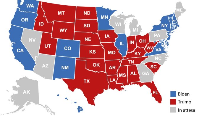 Mentre gli Stati che hanno votato il democratico Biden: Arizona, Oregon, Washington, California, Colorado, Hawaii, Illinois, Connecticut, Virginia, Vermont, Massachussetts, Maryland, Minnesota, Delaware, New Jersey, Rhode Island, New York, New Mexico e il District of Columbia.
