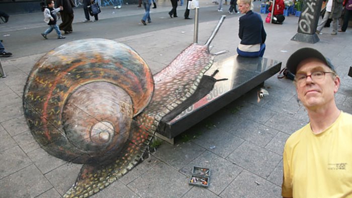 Julian Beever, nato nel 1959 a Cheltenham, è il padre dell'anamorfismo, complicatissima tecnica artistica che si basa sulle visioni prospettiche: il 3D, ma con il gessetto e fatto per strada. Lui è stato uno degli artisti più apprezzati per queste opere che hanno un solo verso per essere apprezzate.