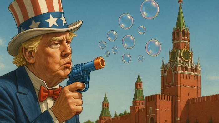 L'immagine scelta da Ria Novosti per illustrare la posizione russa sull'annuncio di Trump è inequivocabile: lo Zio Sam con i tratti di Donald Trump, che con una pistola giocattolo spara bolle di sapone verso il Cremlino. Un'illustrazione grottesca, ma ufficiale, utilizzata dall’agenzia di Stato per accompagnare un editoriale che liquida come inconcludenti le nuove mosse di Washington contro Mosca. Il titolo del commento riecheggia una frase pronunciata da Trump durante il suo primo incontro con Zelensky, ribaltandone però il senso in chiave beffarda: «Washington non ha le carte per minacciare Mosca».