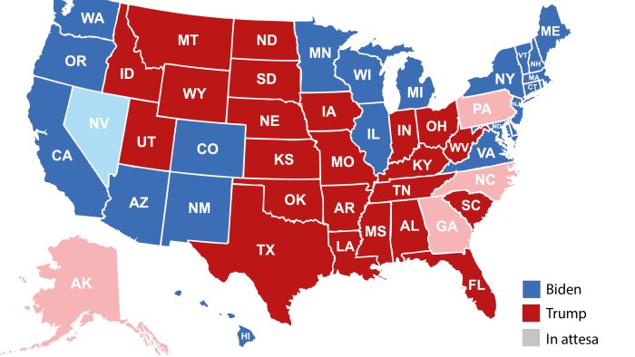 Joe Biden a un passo dalla White House. Dopo aver conquistato la vittoria in Michigan e nel Wisconsin, al candidato democratico basta vincere in un altro stato chiave, tra il Nevada dove è in vantaggio, o tra la Georgia, North Carolina e Pennsylvania dove, invece, è in vantaggio Donald Trump. Attualmente Biden è a quota 264 grandi elettori. L'attuale presidente trema, prosegue la sua campagna contro i brogli elettorali su Twitter, e attacca minacciando di rivolgersi alla Corte Suprema.
