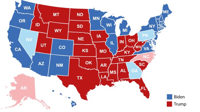 Biden finora ha 253 voti elettorali e il presidente ne ha 213, secondo le proiezioni della CNN. Resta, infine, da tenere sott'occhio lo stato della Pennsylvania, il quale potrebbe portare Biden oltre la soglia dei 270 voti.